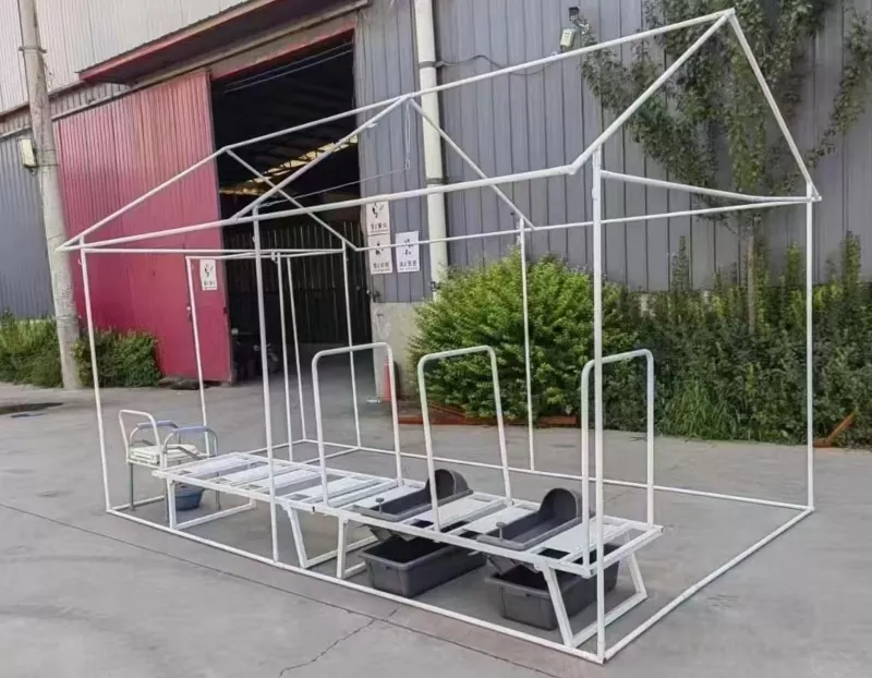 Бо қабули сохтори амудии девори дучандон, хайма мустаҳкам ва нигоҳдорӣ осон аст. Он дорои пояи росткунҷаест, ки вестибюле дорад ва дар болои деворҳои атроф барои вентилятсия ҷойҳо ҷудо карда шудаанд. Пеш аз ҳама вазифаҳои асосии ҳоҷатхона ва шустани дастҳоро барои қурбониёни офат ва наҷотдиҳандагон таъмин намуда, саломатӣ ва бехатарии ҷамъиятро таъмин мекунад. Бо хусусиятҳои васлкунии зуд, боронҳо ва устуворӣ, хайма ба муҳити беруна ё сахт мутобиқат мекунад. Дар барномаҳои амалӣ, он самаранокии наҷотдиҳии фавқулоддаро ба таври муассир беҳтар мекунад ва хатари интиқоли бемориро коҳиш медиҳад.